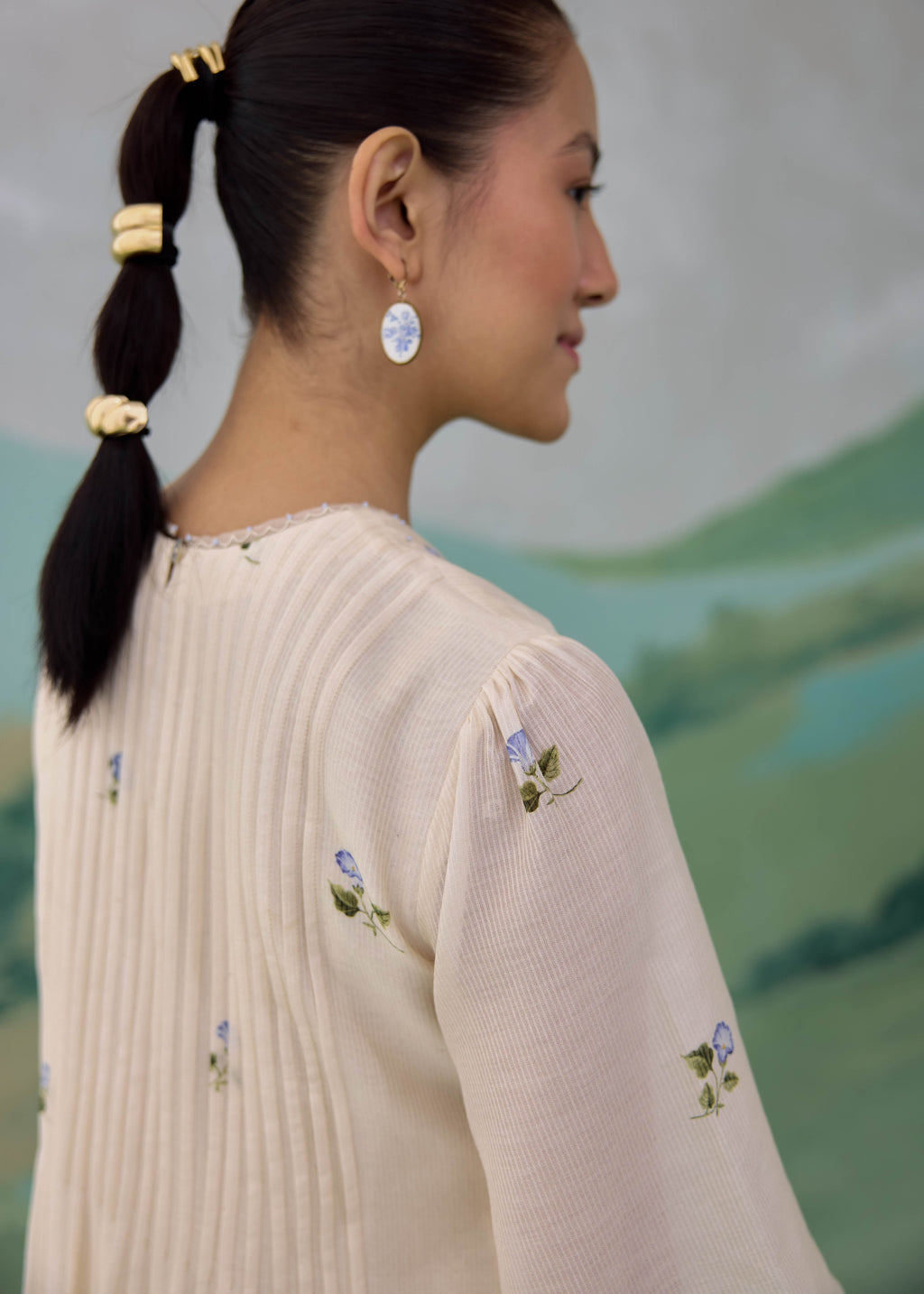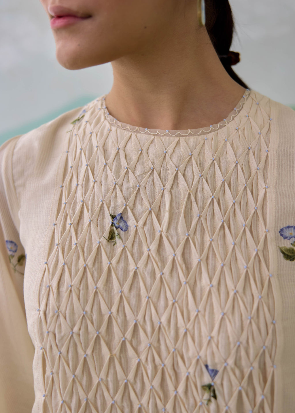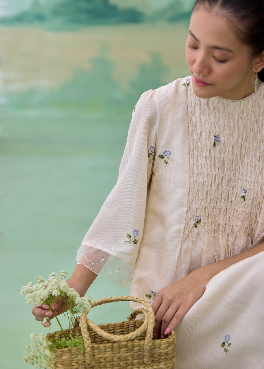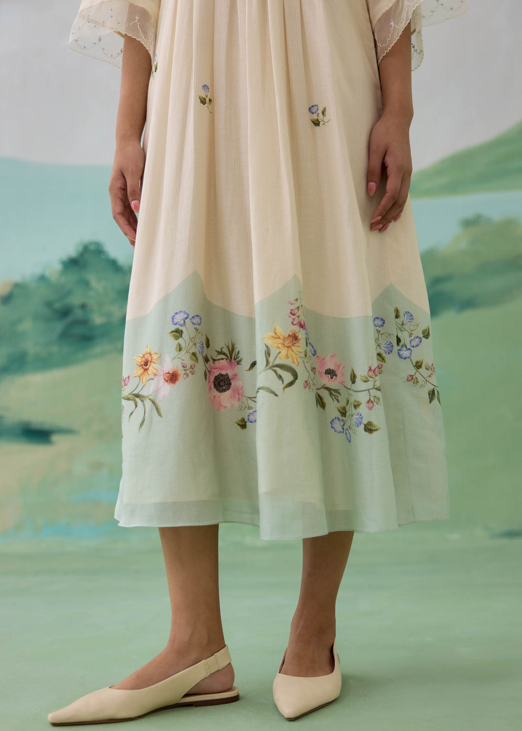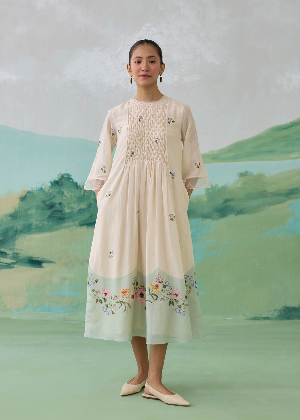 A soft, flowing chanderi dress designed in a gentle color-block palette, blending warm ivory with serene sage tones. The silhouette features intricate pintucks across the yoke, creating a textured, dimensional surface, while delicate scattered floral embroidery adds a quiet, feminine charm. The sleeves are finished with sheer organza panels and fine embroidered lace edging, lending lightness and movement. Thoughtfully designed with side pockets, the dress balances ease with refined detailing.