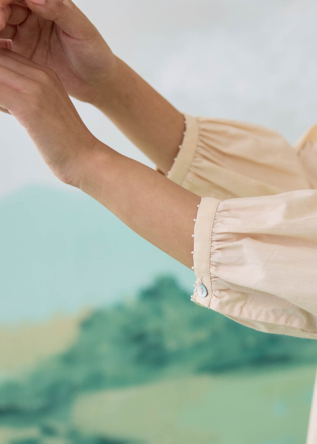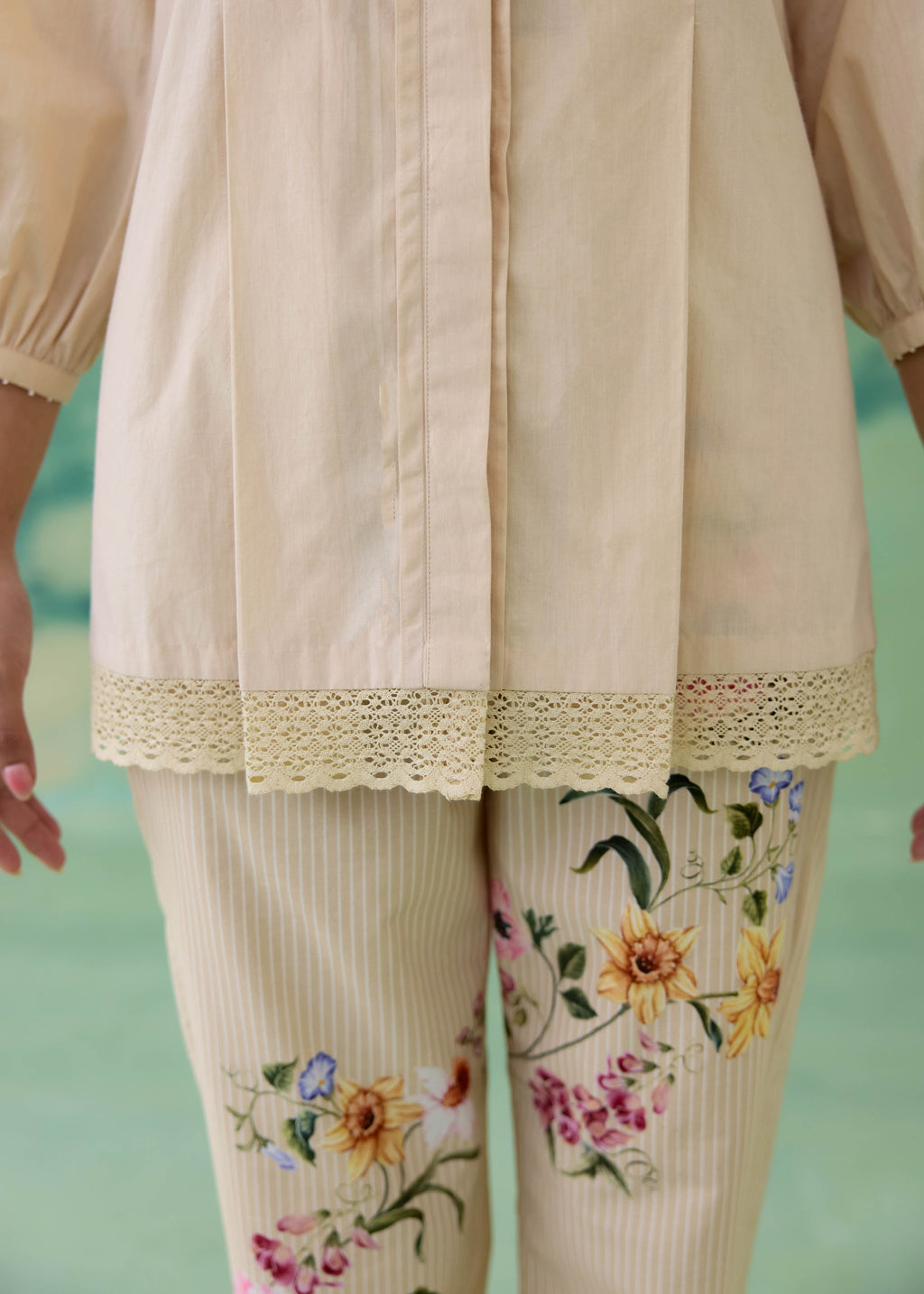 A sand hue cotton poplin shirt featuring a clean front placket and delicate lace detailing along the hem. Finished with soft gathered sleeves and floral motifs accented with beaded tassels, adding a subtle sense of movement and craft.